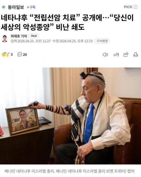 네타냐후 “전립선암 치료” 공개에…“당신이 세상의 악성종양” 비난 쇄도