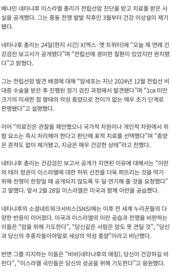 네타냐후 이스라엘 총리가 소셜미디어를 통해 자신이 암 치료를 받은 사실을 뒤늦게 털어놨습니다. 전립선암 초기 진단을 받고 비밀리에 표적 방사선 치료를 이미 마쳤다는 겁니다. 지난 2월 이란을 향한 이스라엘과 미국의
