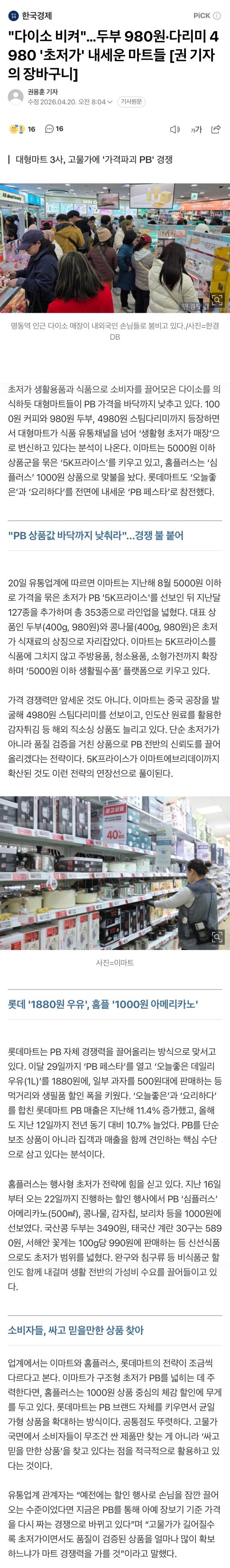 초저가 생활용품과 식품으로 소비자를 끌어모은 다이소를 의식하듯 대형마트들이 PB 가격을 바닥까지 낮추고 있다. 1000원 커피와 980원 두부, 4980원 스팀다리미까지 등장하면서 대형마트가 식품 유통채널을 넘어 ‘