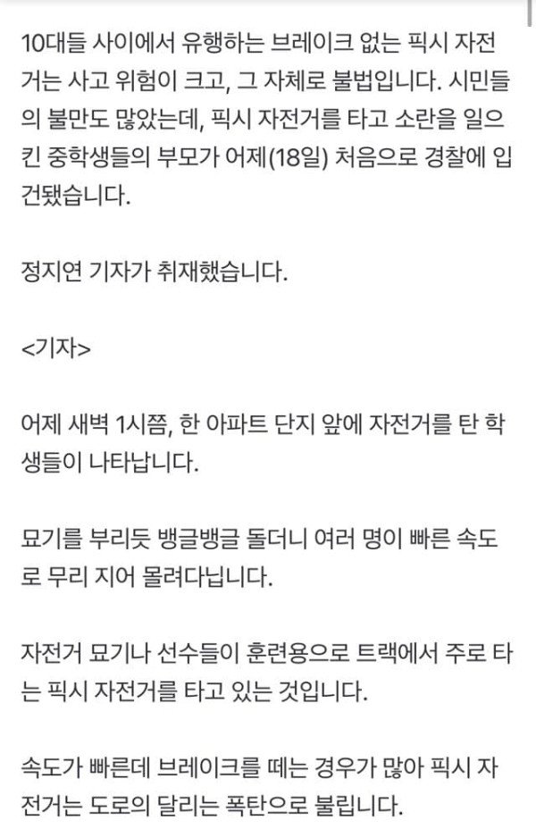 10대들 사이에서 유행하는 브레이크 없는 픽시 자전거는 사고 위험이 크고, 그 자체로 불법입니다. 시민들의 불만도 많았는데, 픽시 자전거를 타고 소란을 일으킨 중학생들의 부모가 어제(18일) 처음으로 경찰에 입건됐습