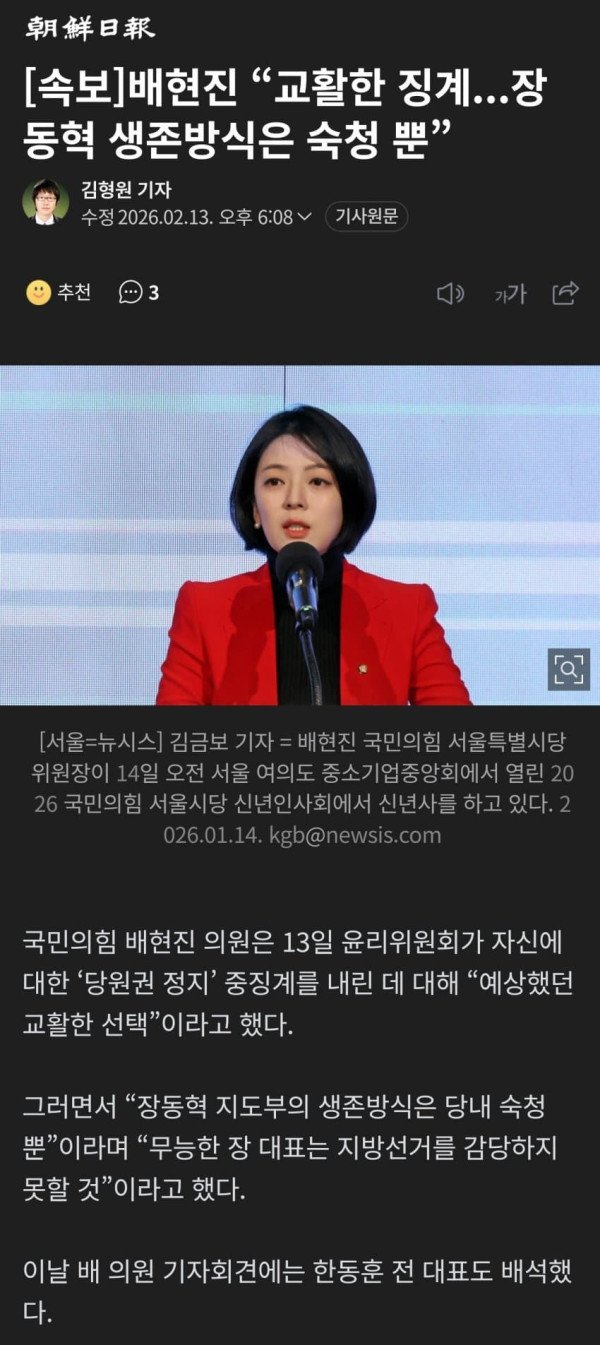 국민의힘 배현진 의원은 13일 윤리위원회가 자신에 대한 ‘당원권 정지’ 중징계를 내린 데 대해 “예상했던 교활한 선택”이라고 했다. 그러면서 “장동혁 지도부의 생존방식은 당내 숙청 뿐”이라며 “무능한 장 대표는 지방