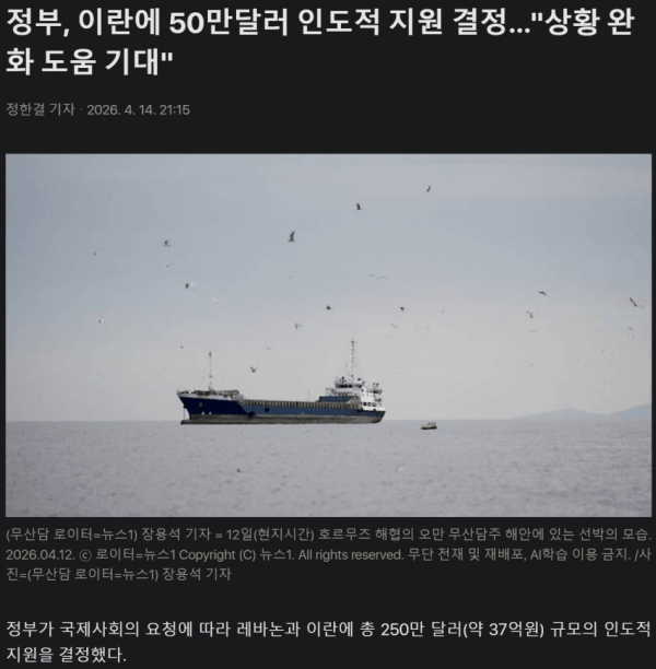 정부가 중동전쟁에 휘말린 이란과 레바논에 총 250만달러에 달하는 인도적 지원에 나선다. 외교부는 14일 이란에 50만달러, 레바논에 200만달러씩 인도적 지원을 하기로 결정했다고 밝혔다. 중동 정세와 관련하여 유엔