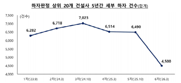 지난 2025년 9월부터 2026년 2월까지 6개월 동안 하심위로부터 하자 판정을 가장 많이 받은 건설사는 순영종합건설(249건)이었으며 이어 신동아건설(120건), 빌텍종합건설(66건), 라인(56건), 에스지건설(55건) 등 순이었습니다.