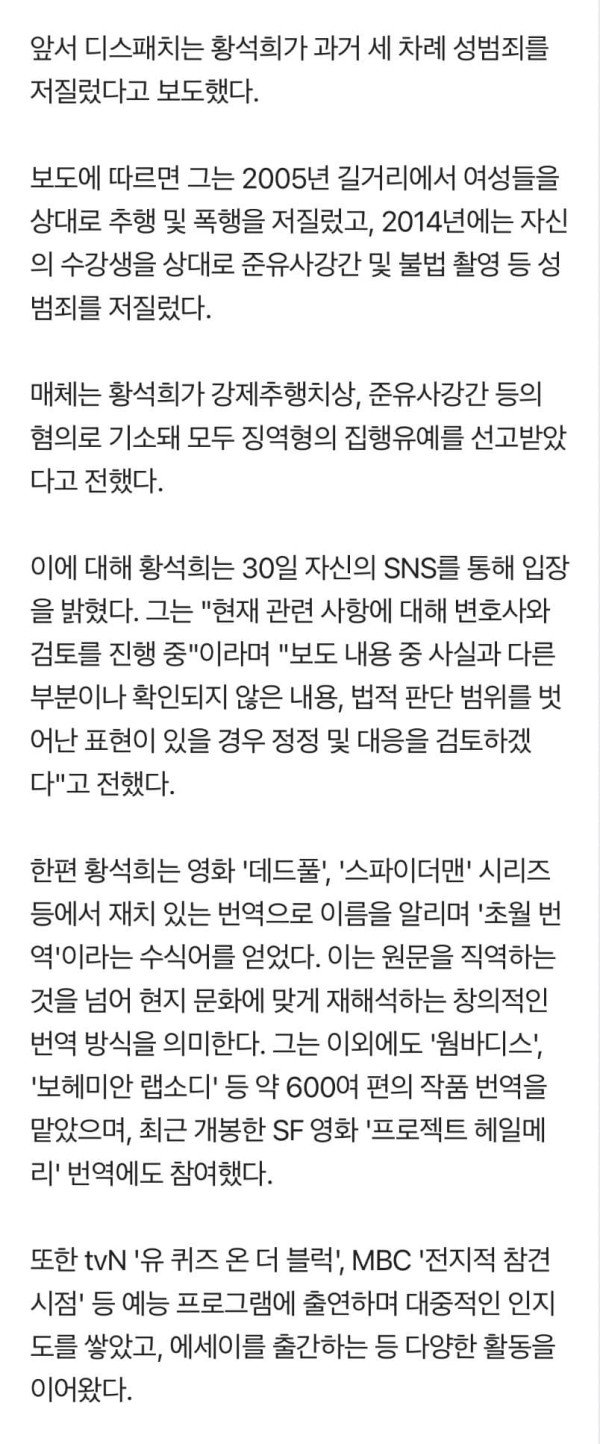 강제추행 준유사강간 신체촬영 번역 황석희 3차례 성범죄