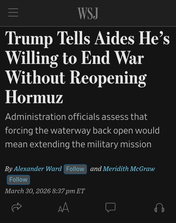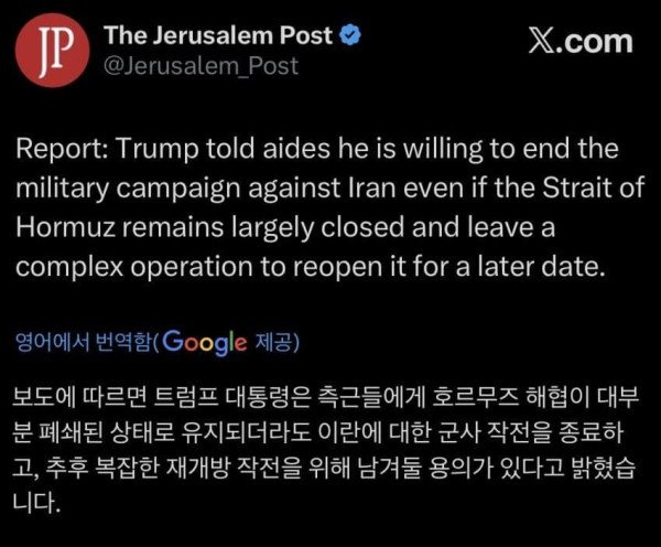 속보: 트럼프 대통령은 보좌관들에게 호르무즈 해협이 대체로 폐쇄된 상태로 유지되더라도 이란에 대한 군사 캠페인을 종료할 준비가 되어 있다고 말했다고 미국 관리들이 보도했습니다.