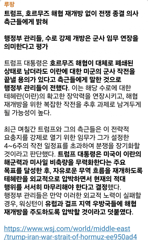 월스트리트 저널이 말하는 호르무즈 해협 작전 종료 관련 분석
