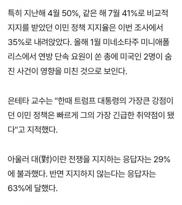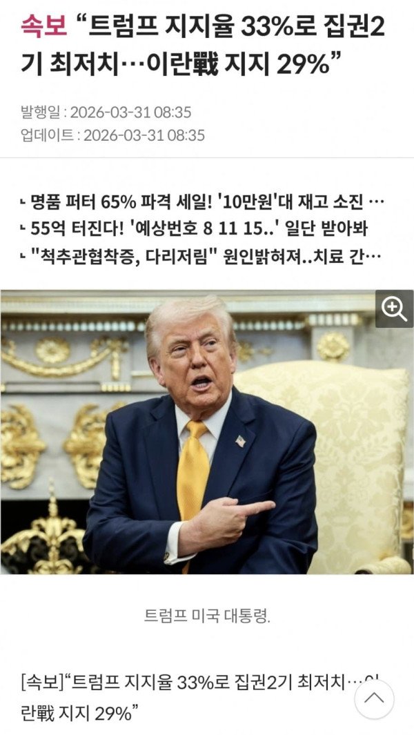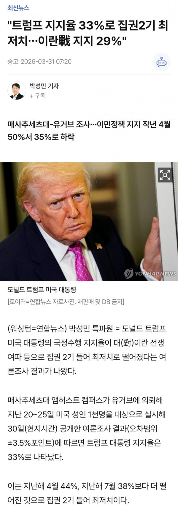 (워싱턴=연합뉴스) 박성민 특파원 = 도널드 트럼프 미국 대통령의 국정수행 지지율이 대(對)이란 전쟁 여파 등으로 집권 2기 들어 최저치로 떨어...