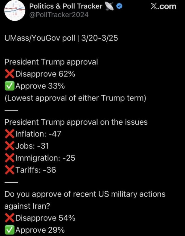 UMass/YouGov 여조에서 트럼프 지지율 33%, 2기 최저치