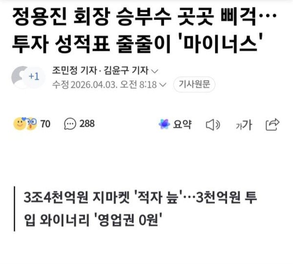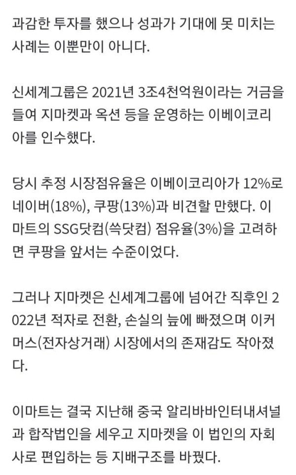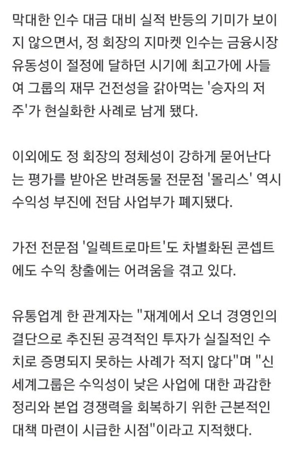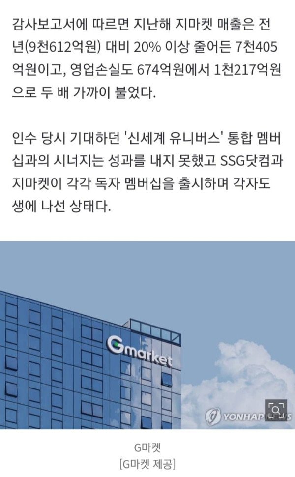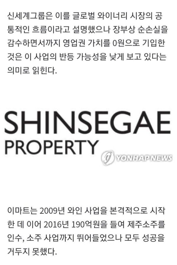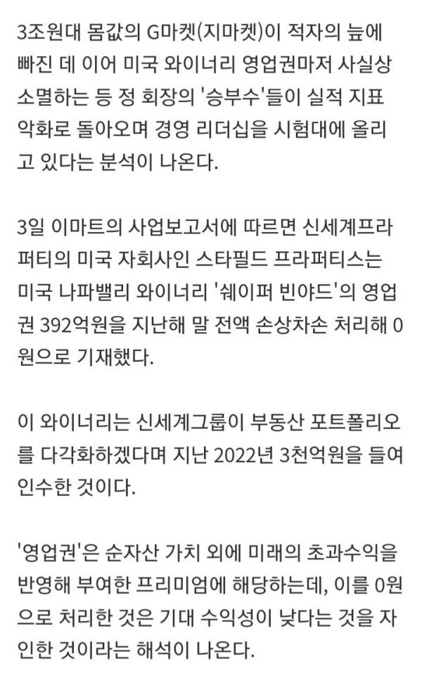 3조4천억원 지마켓 '적자 늪'…3천억원 투입 와이너리 '영업권 0원' 김윤구 조민정 기자 = 신세계그룹이 본업인 이마트의 부진과 재무적 부담 가중이라는 이중고를 겪으면서 과거 정용진 회장의 주도로 단행된 대규모 투