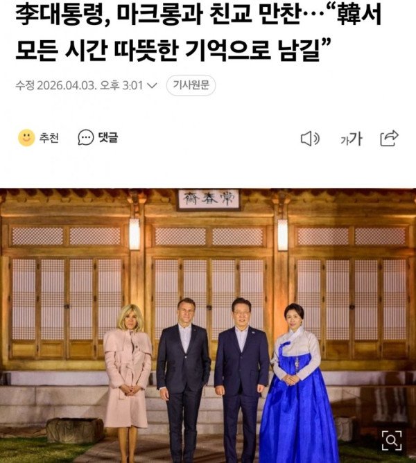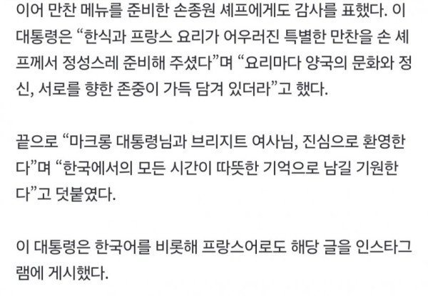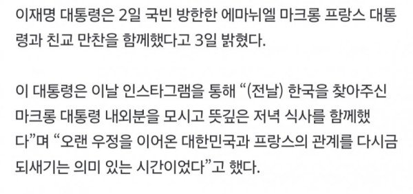“한식과 프랑스 요리가 어우러진 특별한 만찬을 손종원 셰프께서 정성스레 준비해 주셨다.” 이재명 대통령은 2일 국빈 방한한 에마뉘엘 마크롱 프랑스 대통령과 친교 만찬을 함께했다고 3일 밝혔다. 이 대통령은 이날 인스