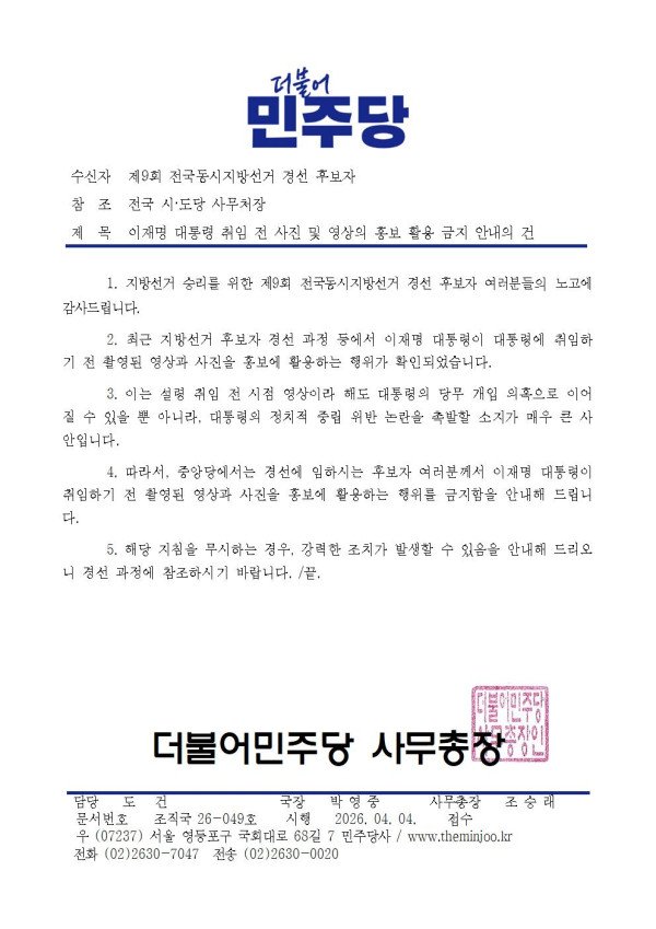 4. 따라서, 중앙당에서는 경선에 임하시는 후보자 여러분께서 이재명 대통령이 취임하기 전 촬영된 영상과 사진을 홍보에 활용하는 행위를 금지함을 안내해 드립니다.