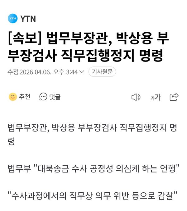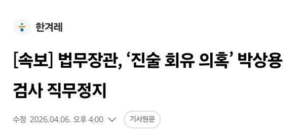 [속보] 법무부장관, 박상용 부부장검사 직무집행정지 명령