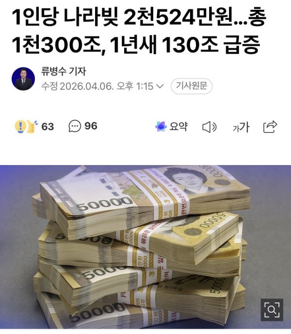 1인당 나라빚 2524만원..총1300조,1년새 130조 급증