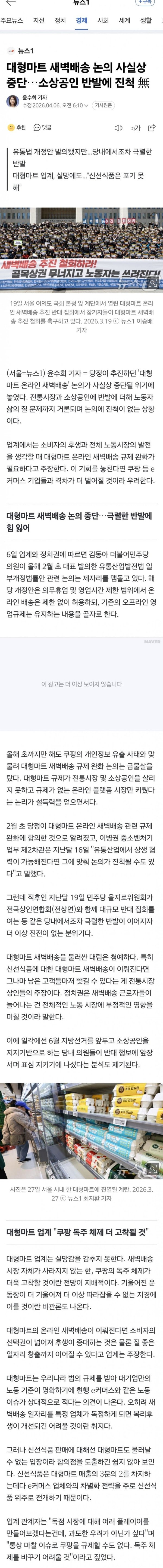 당정이 추진하던 '대형마트 온라인 새벽배송' 논의가 사실상 중단될 위기에 놓였다. 전통시장과 소상공인에 반발에 더해 노동자 삶의 질 문제까지 거론되며 논의에 진척이 없는 상황이다. 업계에서는 소비자의 후생과 전체 노