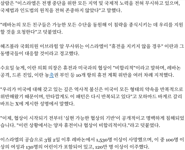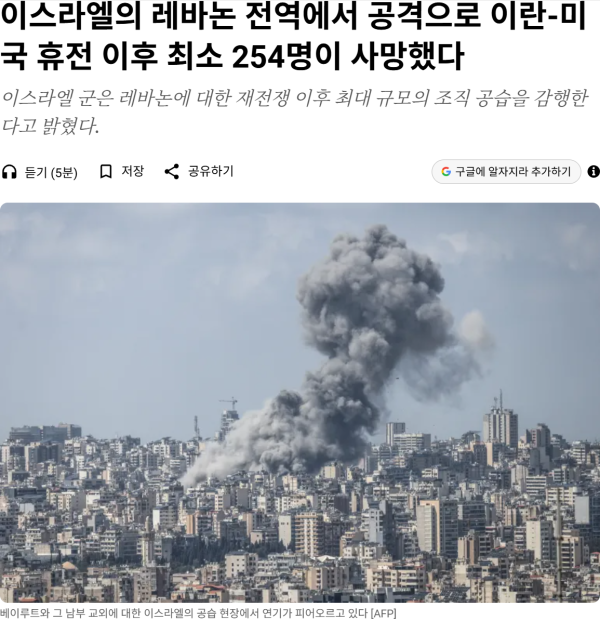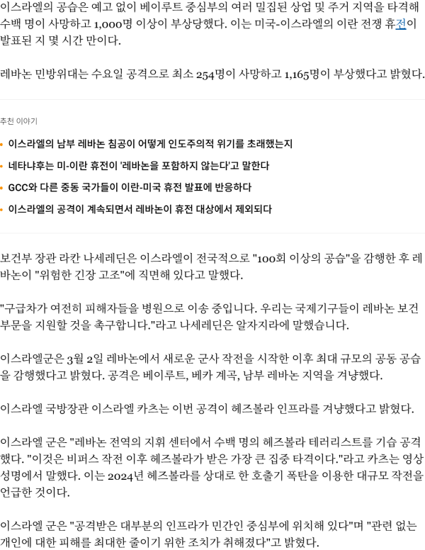 이스라엘의 레바논 전역 공격으로 이란-미국 휴전 이후 최소 254명 사망