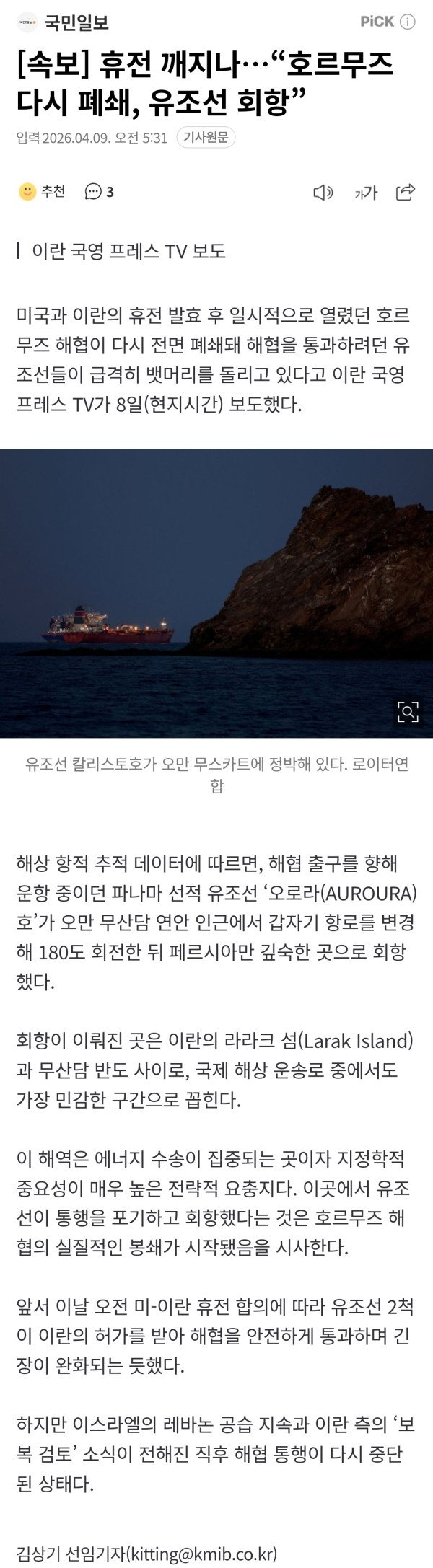 앞서 이날 오전 미·이란 간 휴전 합의에 따라 유조선 2척이 이란 당국의 허가를 받아 해협을 통과하면서 긴장이 완화되는 듯한 흐름이 나타났다.