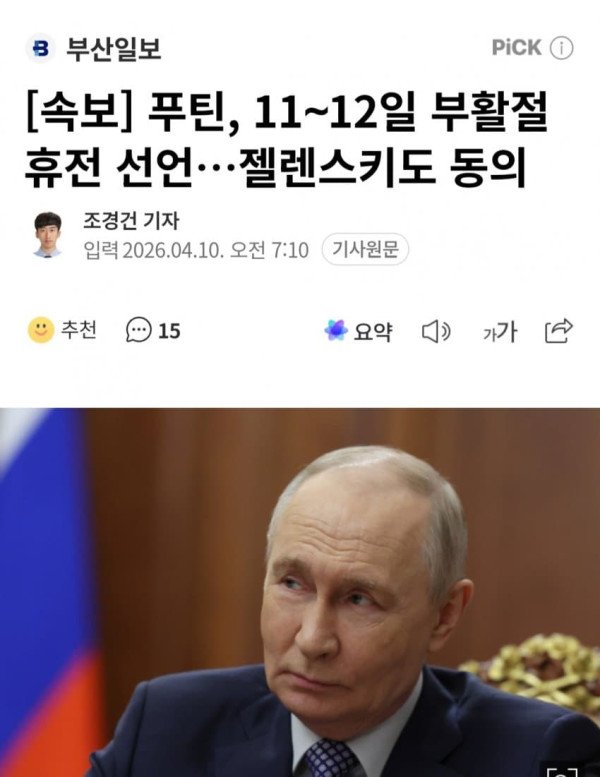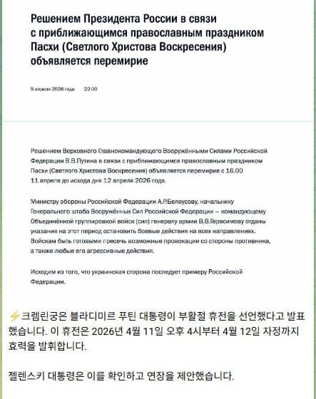 블라디미르 푸틴 러시아 대통령이 러시아 정교회 부활절을 맞아 우크라이나 전쟁에서 일시 휴전을 선언했습니다. 9일(현지시각) AP통신에 따르면 푸틴 대통령은 크렘린궁 성명을 통해 “11일 오후 4시부터 12일 자정까지