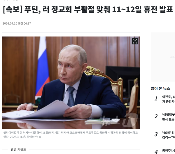 속보] 푸틴, 러 정교회 부활절 맞춰 11~12일 휴전 발표