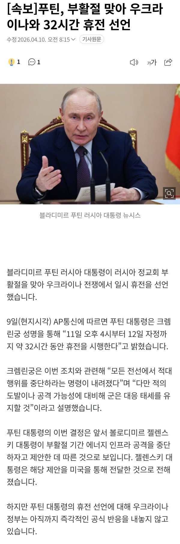 [속보]푸틴, 부활절 맞아 우크라이나와 32시간 휴전 선언