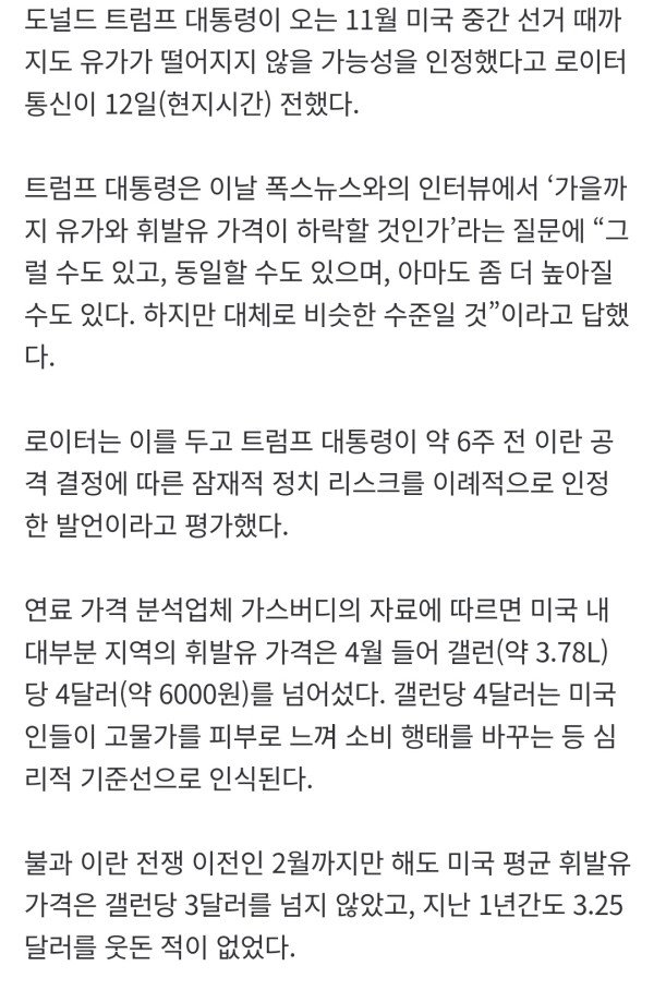 [속보]트럼프 "가을까지 유가 더 높아질수도"
