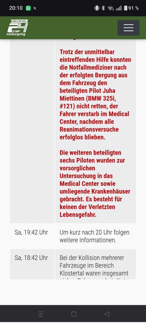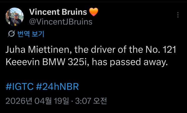사고로 작고한 드라이버는 스웨덴 국적의 66세 Juha miettinen, 121번 BMW 325i의 드라이버 였습니다.
