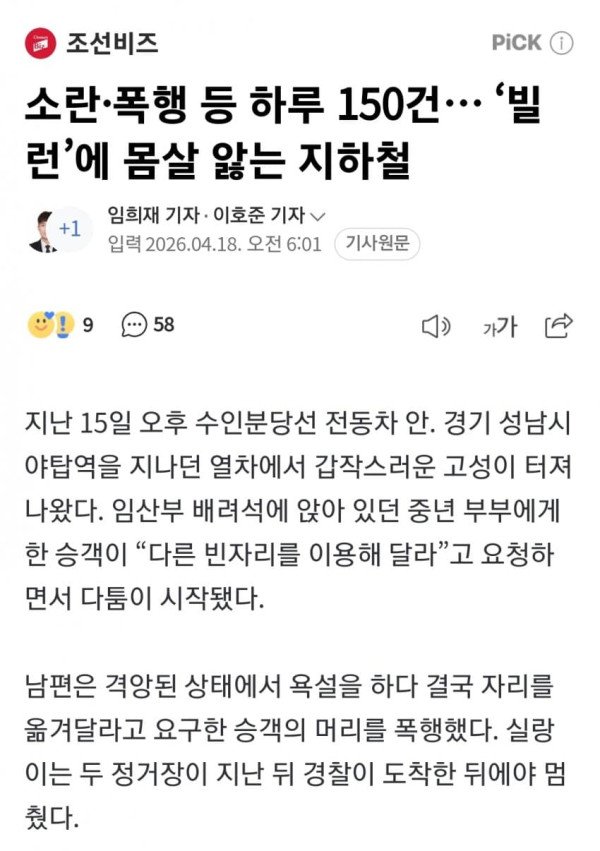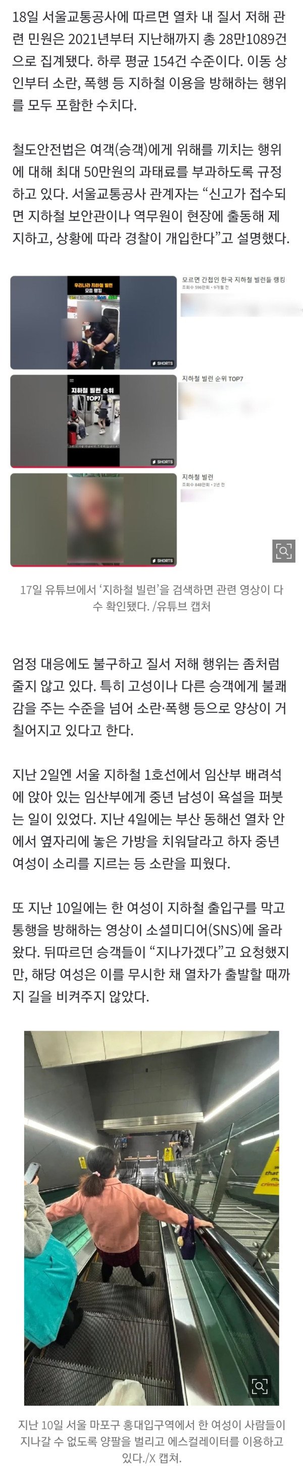 소란·폭행 등 하루 150건… ‘빌런’에 몸살 앓는 지하철