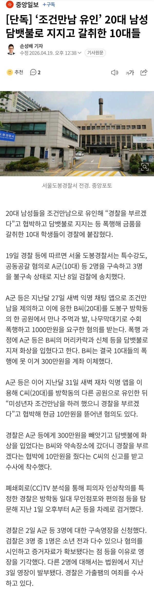 20대 남성들을 조건만남으로 유인해 “경찰을 부르겠다”고 협박하고 담뱃불로 지지는 등 폭행해 금품을 갈취한 10대 학생들이 경찰에 붙잡혔다. 19일 경찰 등에 따르면 서울 도봉경찰서는 특수강도, 공동공갈 혐의로 A군