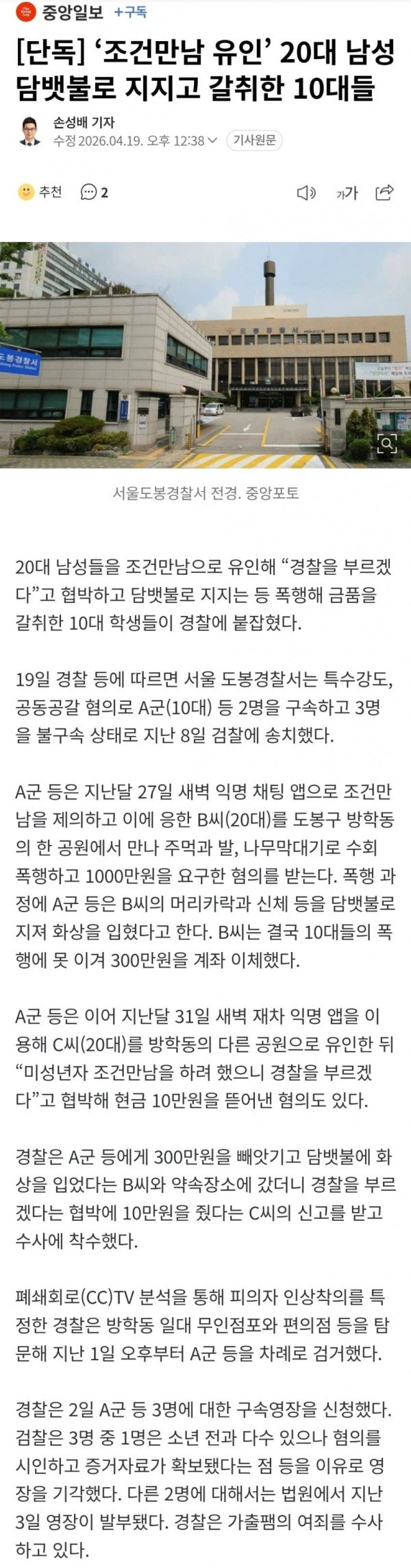 [단독] ‘조건만남 유인’ 20대 남성 담뱃불로 지지고 갈취한 10대들