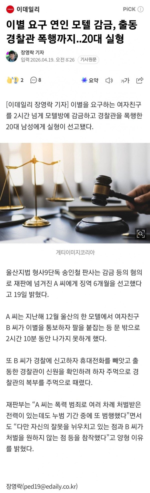 이별 요구 연인 모텔 감금, 출동 경찰관 폭행까지..20대 실형