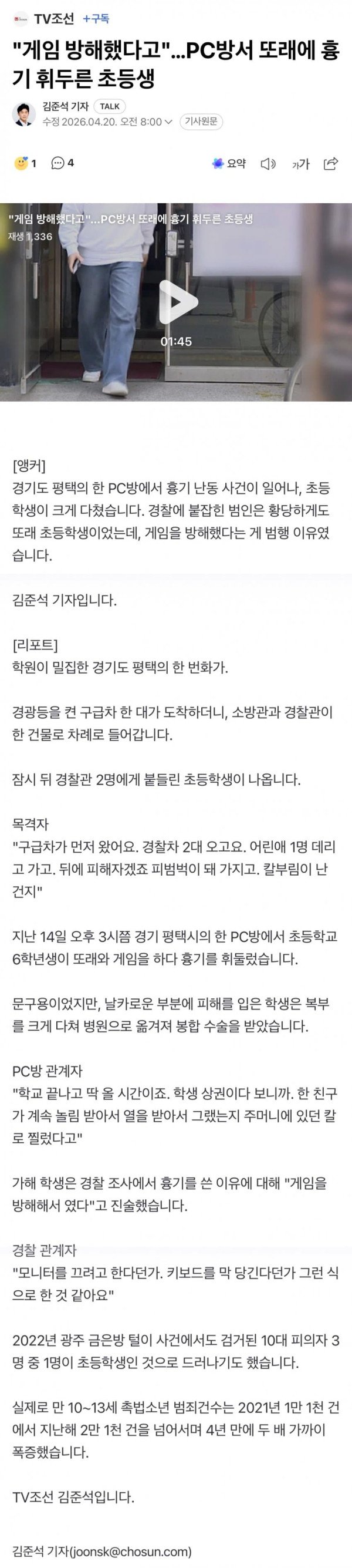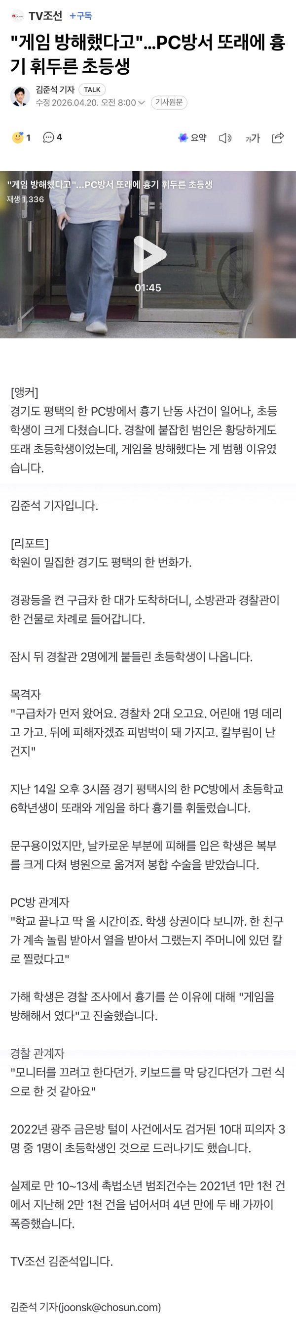 "게임 방해했다고"…PC방서 또래에 흉기 휘두른 초등생