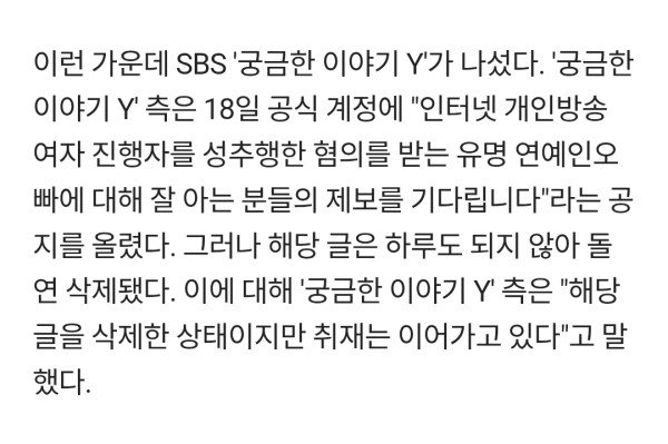 궁금한 이야기 Y, 걸그룹 친오빠 취재글 올렸다 돌연 삭제