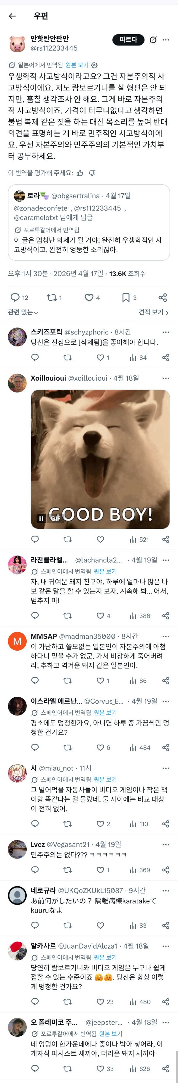근데 여기에 대해 저 일본인이 반박을 올리자