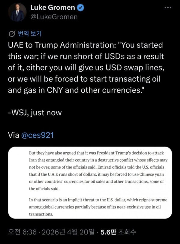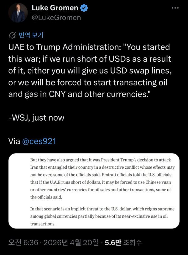 “이 전쟁을 시작한 건 당신들입니다. 그로 인해 우리에게 달러가 부족해지면, 당신들이 달러 스왑 라인을 제공해 주지 않는 한, 우리는 석유와 가스 거래를 위안화나 다른 통화로 진행할 수밖에 없을 것입니다.” - WSJ
