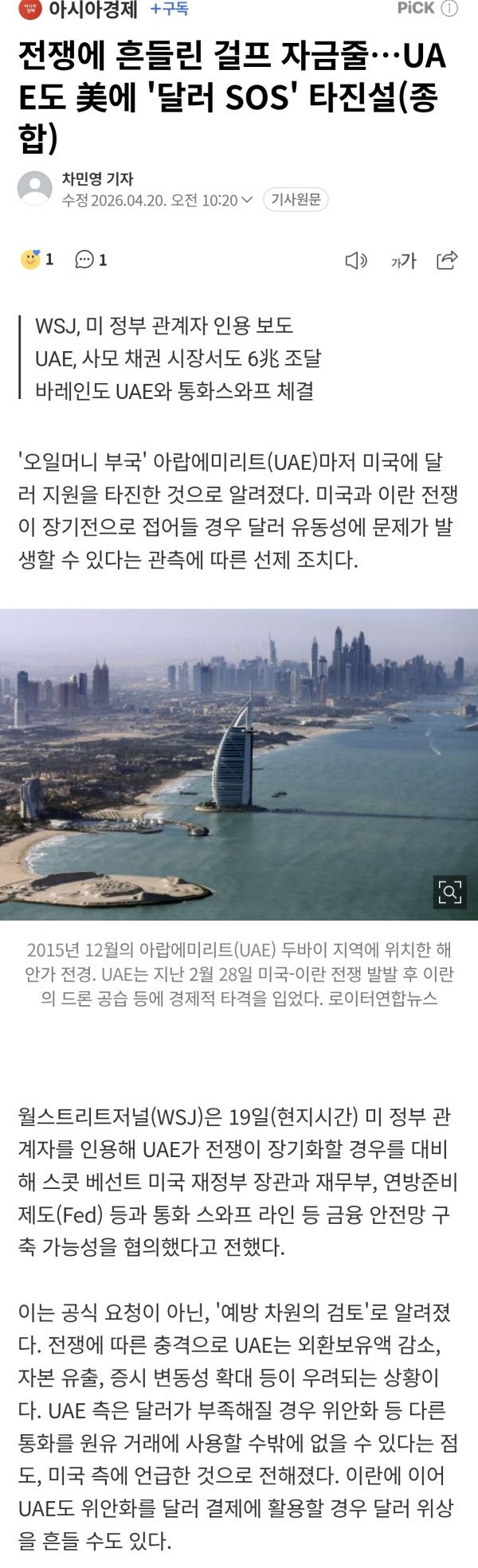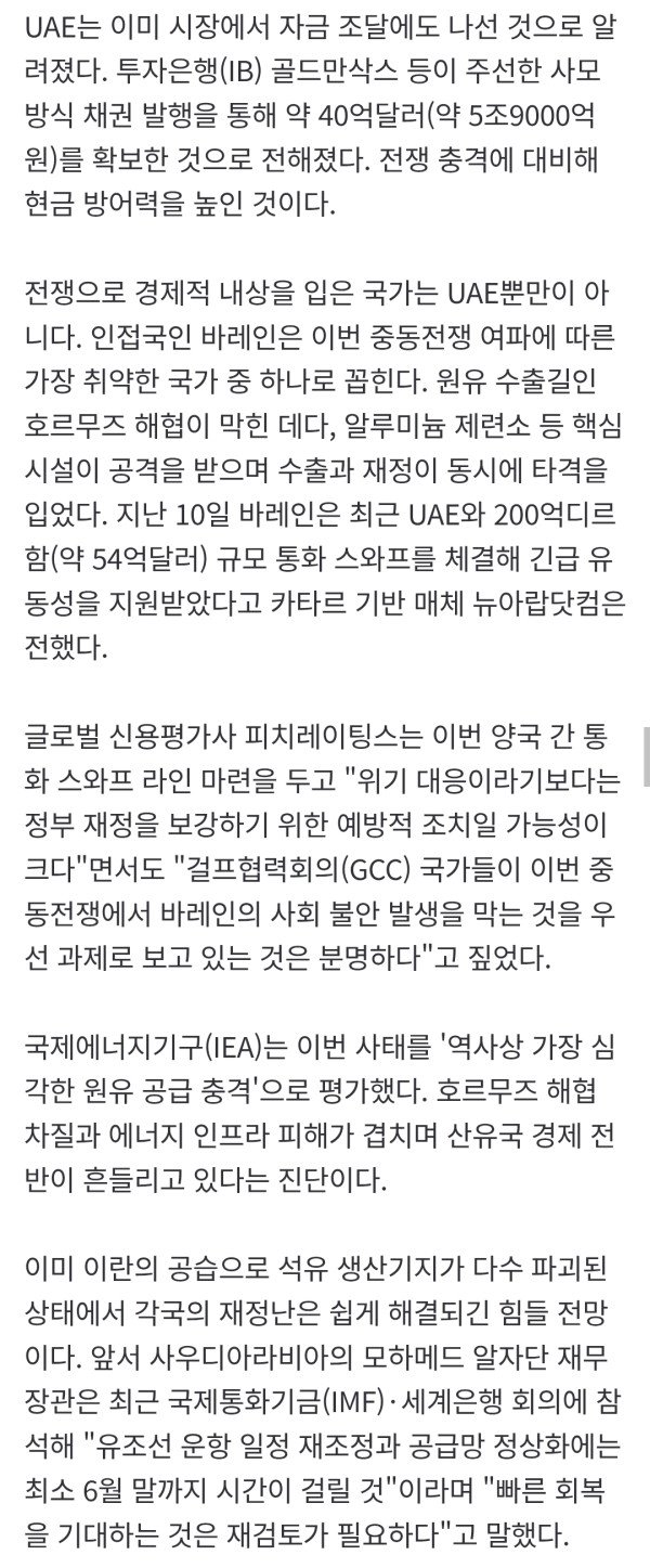 '오일머니 부국' 아랍에미리트(UAE)마저 미국에 달러 지원을 타진한 것으로 알려졌다. 미국과 이란 전쟁이 장기전으로 접어들 경우 달러 유동성에 문제가 발생할 수 있다는 관측에 따른 선제 조치다. 월스트리트저널(WS