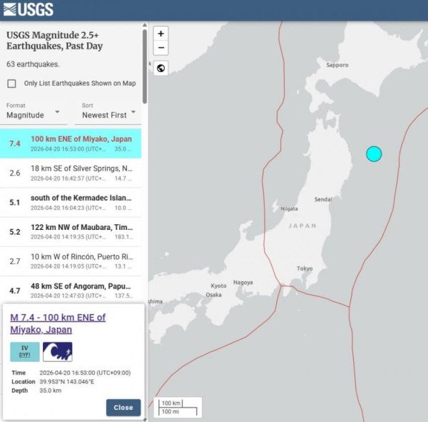 일본 혼슈 동쪽 해역서 규모 7.4 지진... 쓰나미 경보