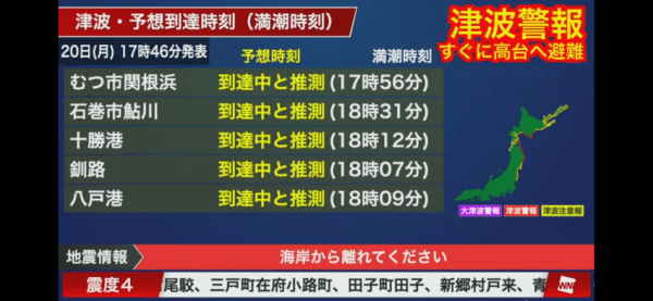 JR 홋카이도 구시로 지사에 따르면 쓰나미 경보 발표의 영향으로 오후 5시 반 현재, JR 네무로선에서는 삿포로발 구시로행 '특급 오오조라 7호'가 우라호로역에 정차 중이며, 오비히로와 구시로를 잇는 보통 열차 일부가 안전 확인을 위해 정차 중입니다.