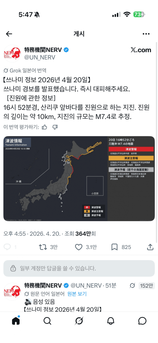 로 추정된 지진 알림이야. 일본 쪽에선 이런 급이면