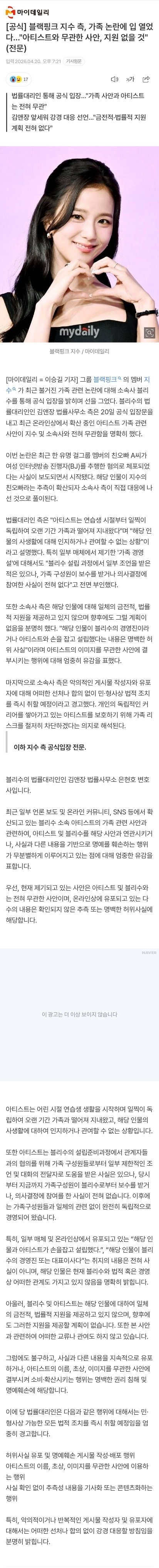 지수 측, 가족 논란에 입 열었다 "아티스트와 무관한 사안, 지원없을것"