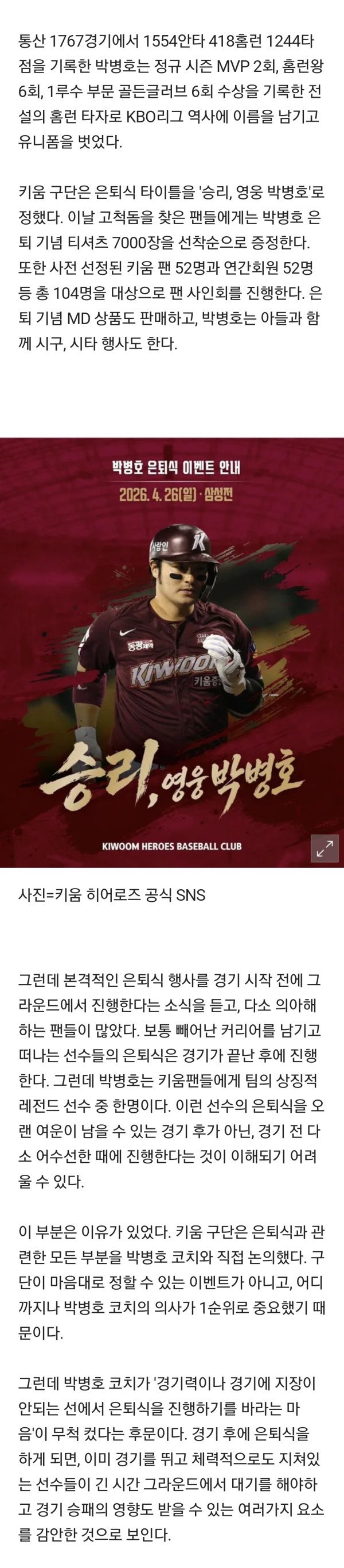 오피셜) 박병호 은퇴식 4/26(일) 고척 삼성전