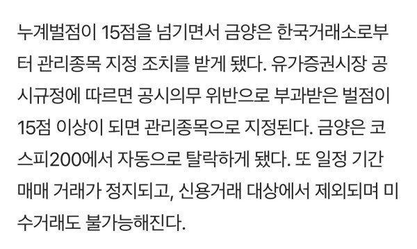 관리종목이 된 금양의 거래가 3월 5일 정지된다.