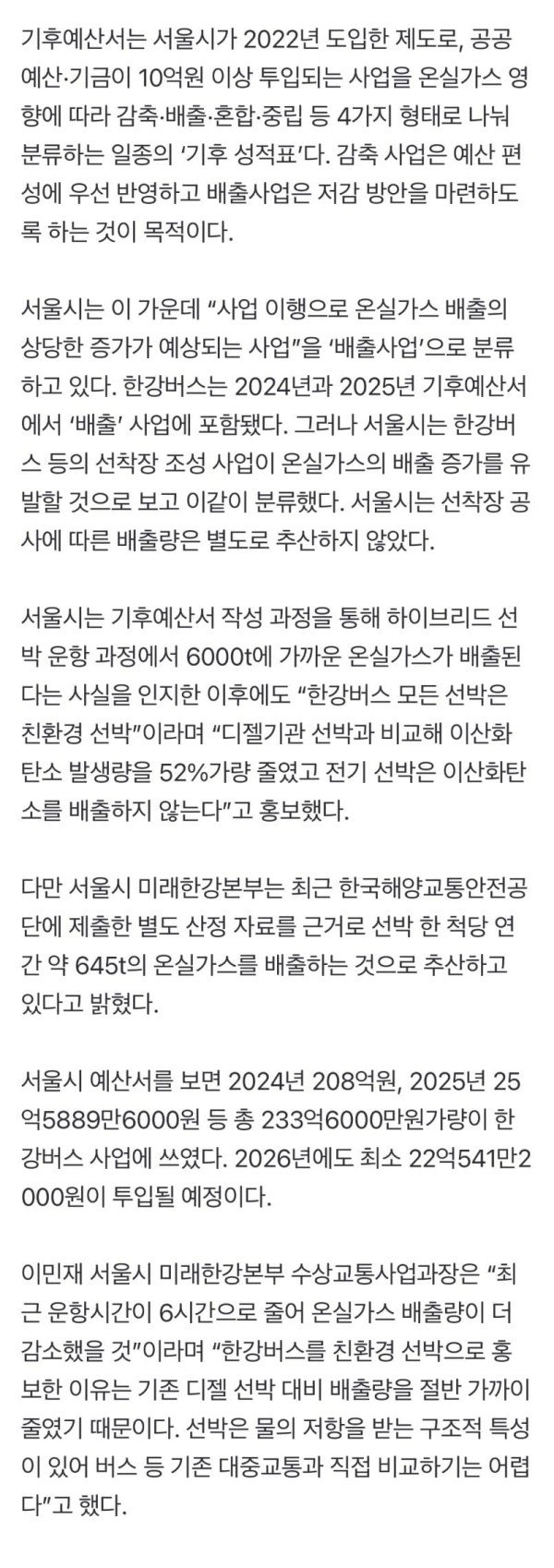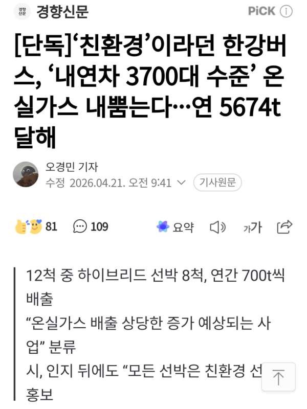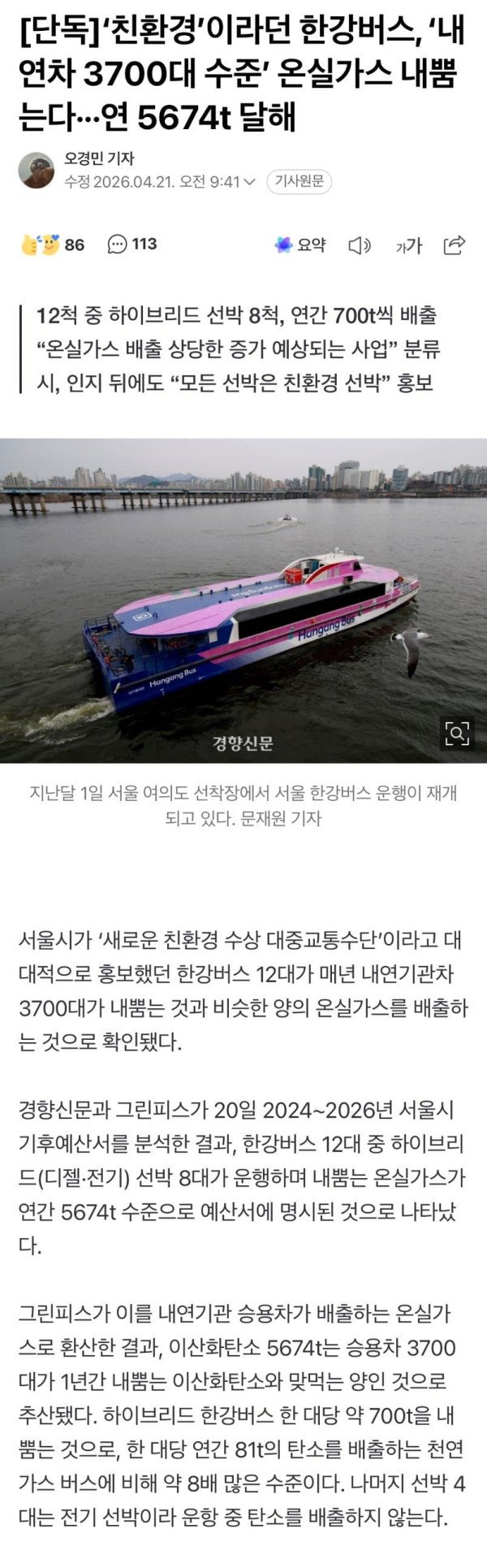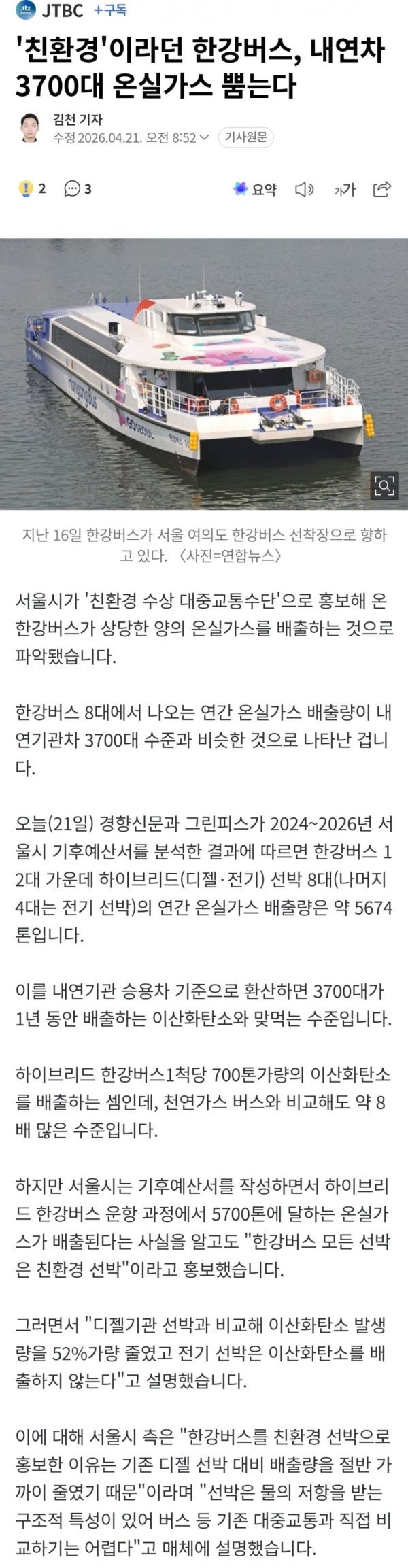 '친환경'이라던 한강버스, 내연차 3700대 온실가스 뿜는다