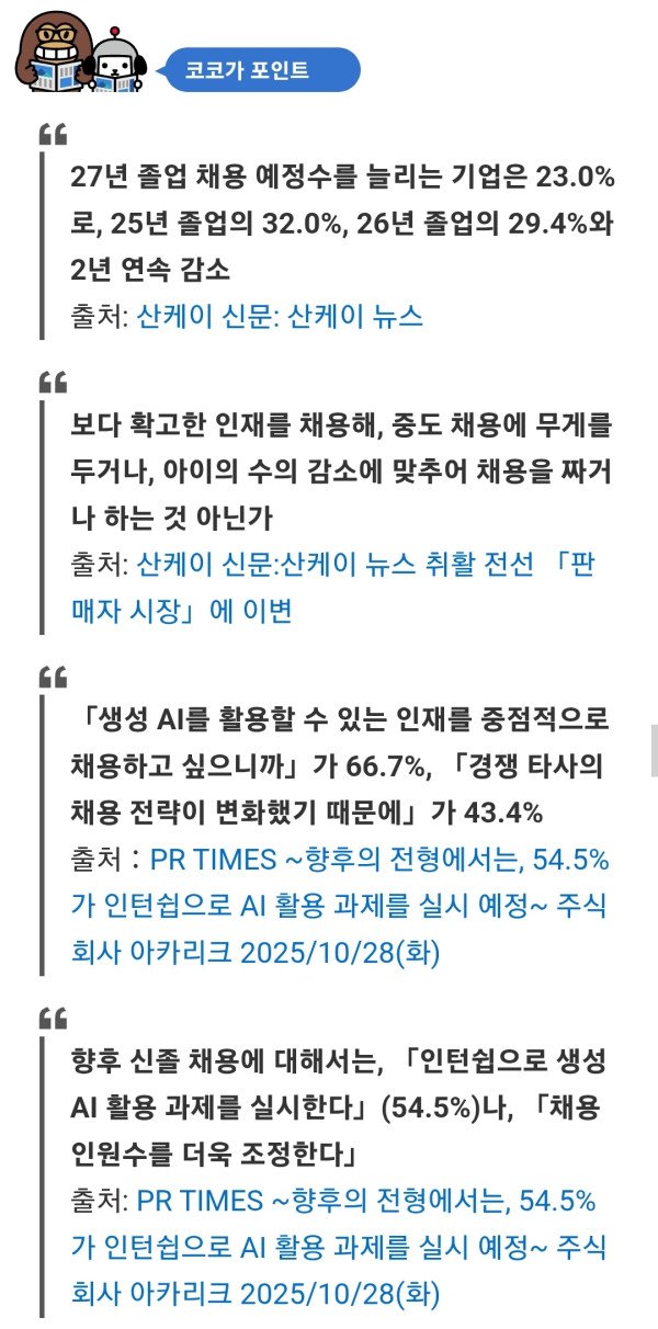 新卒市場に異変が起きている。パナソニックHDは前年度比100人減、クボタは前年の約4分の1となる60人、サントリー26年度比で8%減、関西みらい銀行は20%減に絞るなど、大手が相次いで「厳選採用」へ舵