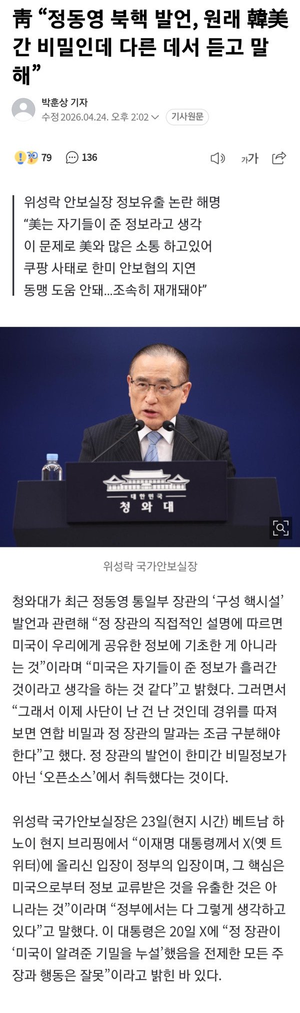 정부 "북핵 발언 원래 비밀인데 다른 데서 듣고 말해"