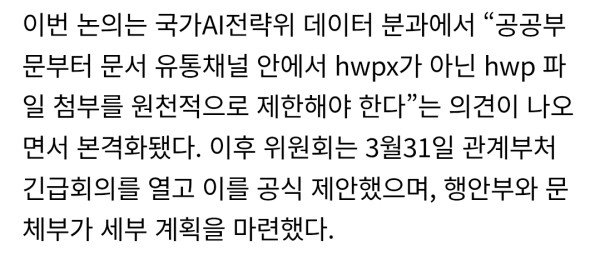 정부가 공공부문에서 쓰이는 한글 hwp 파일 사용을 단계적으로 줄이기로 했다. 대신 인공지능(AI)이 읽고 활용하기 쉬운 개방형 문서 형식인 hwpx 사용을 늘린다는 계획이다. 국가인공지능전략위원회는 행정안전부·문화