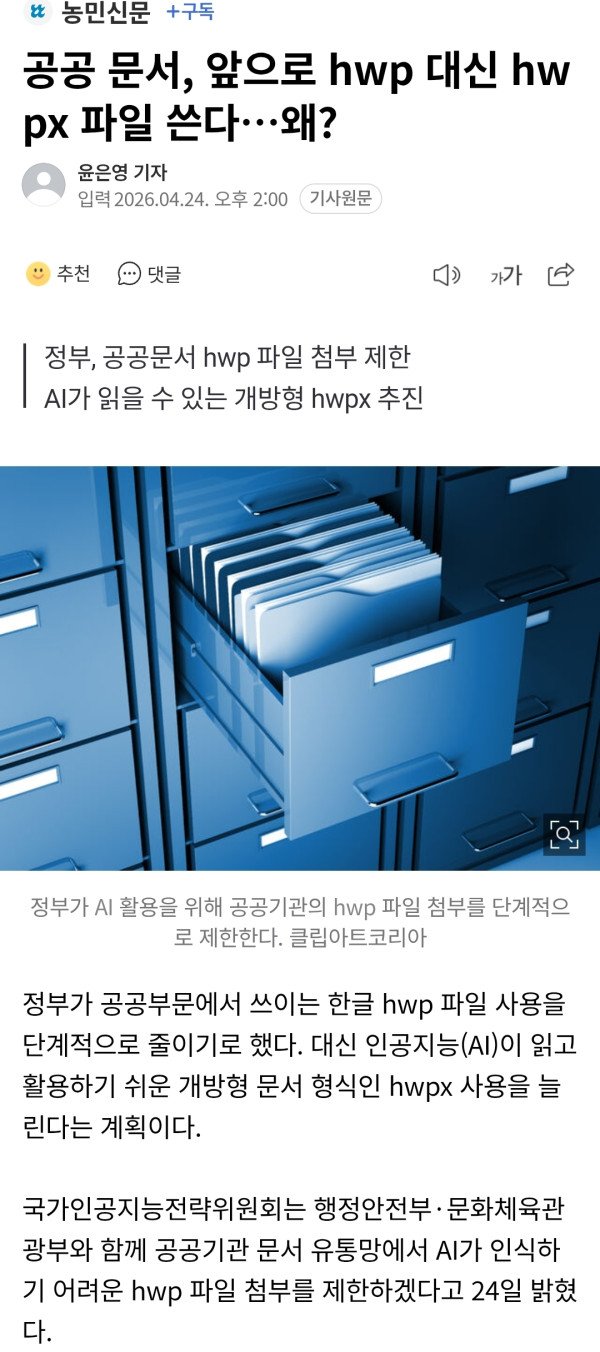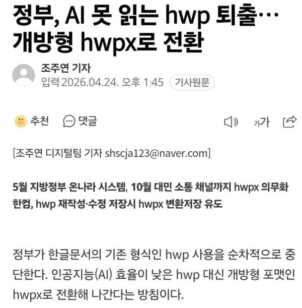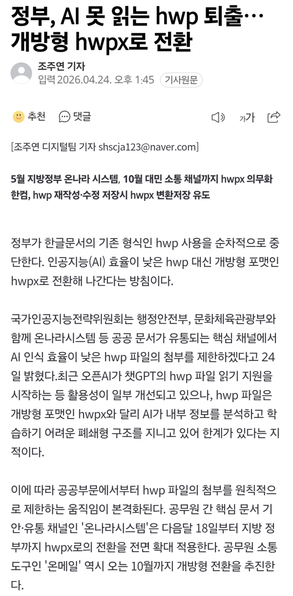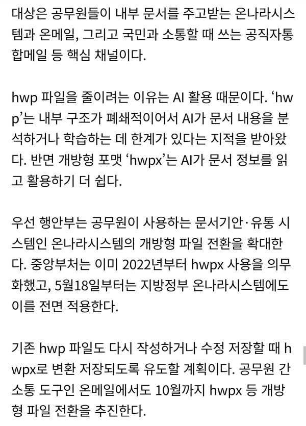 정부에서 AI가 못 읽는 hwp 퇴출하고 개방형 hwpx로 전환