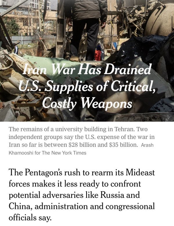 NYT) 이란 전쟁으로 미국의 핵심 무기 비축량이 고갈되는 중
