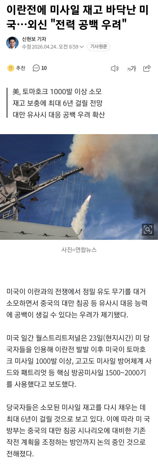 이처럼 무기 재고가 줄어든 상황에서 단기간 내 추가 군사 충돌이 발생할 경우, 미군이 전력 공백을 겪을 가능성이 있다는 지적이 나온다.