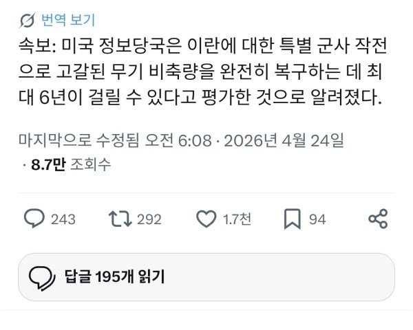 미국 정보기관의 평가에 따르면 이란은 전쟁 이전 보유량의 약 70%, 미사일 발사대의 약 60%를 여전히 보유하고 있을 가능성이 높다고 뉴욕타임스가 보도했습니다.