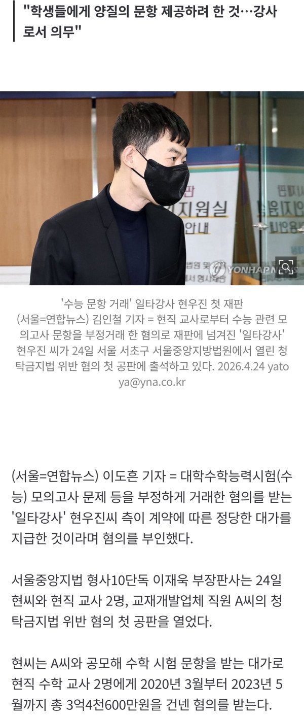 "학생들에게 양질의 문항 제공하려 한 것…강사로서 의무" 대학수학능력시험(수능) 모의고사 문제 등을 부정하게 거래한 혐의를 받는 '일타강사' 현우진씨 측이 계약에 따른 정당한 대가를 지급한 것이라며 혐의를 부인했다.
