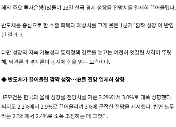 JP모건은 한국의 올해 성장률 전망치를 기존 2.2%에서 3.0%로 대폭 상향했다. 씨티도 2.2%에서 2.9%로 끌어올리며 3%에 근접한 전망을 제시했다. 반면 노무라는 2.3%에서 2.4%로 소폭 조정하는 데 그쳤다.